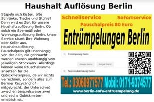 Stapeln sich Kisten, alte Schränke, Tische und Stühle? Dann wird es Zeit für unsere Haushaltsauflösung Berlin pauschal 80 Euro. Ob solch ein Sperrmüll oder Wohnungsauflösung Berlin, Unser Service räumt Ihre Wohnung oder Keller aus. Haushaltsauflösung pauschal gilt unabhängig von der Zeit, die gebraucht werden ebenso unabhängig vom jeweiligen Stockwerk. Allerdings können keine Pauschalsumme ansetzen für die Qubickmeterpreis, da wir nichts verrechnen, sondern alles zum Berliner Recyclinghof mitgebracht, der Unterschied zwischen beispielsweise zwei und sechs Qubickmetern erheblich ist.